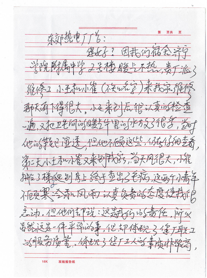 近日,山東聚源熱力公司收到一封來(lái)自濟(jì)寧學(xué)院附屬中學(xué)宿舍張老師寫(xiě)的表?yè)P(yáng)信,信中這樣寫(xiě)道:“東郊熱電廠廠長(zhǎng)(現(xiàn)為山東聚源熱力)您好,因我們宿舍濟(jì)寧學(xué)院附屬中學(xué)2號(hào)樓暖氣不熱,貴廠派了維修工小王和小崔(不知名字)來(lái)我家維修。那天雨下得很大,小王來(lái)到后很認(rèn)真的檢查一遍,又把衛(wèi)生間的暖氣片里的水放了很多,當(dāng)時(shí)他的鞋已濕透,但他不顧這些,仍在仔細(xì)查看。第二天小王和小崔又來(lái)到我家,當(dāng)天風(fēng)很大,小崔搬了梯子爬到房上終于查處了毛病,這兩個(gè)小青年不顧寒冷和風(fēng)雨認(rèn)真負(fù)責(zé)的態(tài)度,使我很感動(dòng),但他們卻說(shuō)這是我們的責(zé)任。雖然這是一件平常的事,但卻體現(xiàn)了您廠職工的服務(wù)質(zhì)量,體現(xiàn)了您廠工人的素質(zhì)非常高,也體現(xiàn)了您廠的廠風(fēng)正,培養(yǎng)了這么好的職工,請(qǐng)領(lǐng)導(dǎo)對(duì)他們進(jìn)行表?yè)P(yáng),號(hào)召全體職工向他們學(xué)習(xí)。弘揚(yáng)正氣,使我們的社會(huì)更加和諧?!?/span>